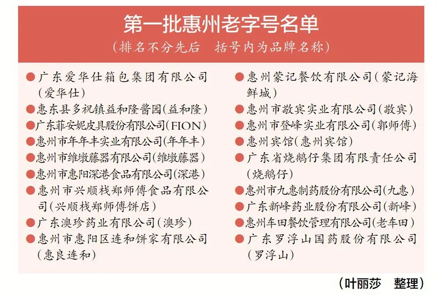 12月18日,惠州市商务局发布《关于公布第一批惠州老字号名单的通知》,认定18个品牌为第一批惠州老字号。