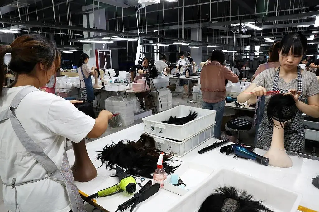 在河南许昌,城市周边的大小村落里,遍布假发工厂、配件超市。无论院子、二层小楼,妇女们紧张地踩着缝纫机,或做着打包动作,到处排列着黑亮的假发头模。