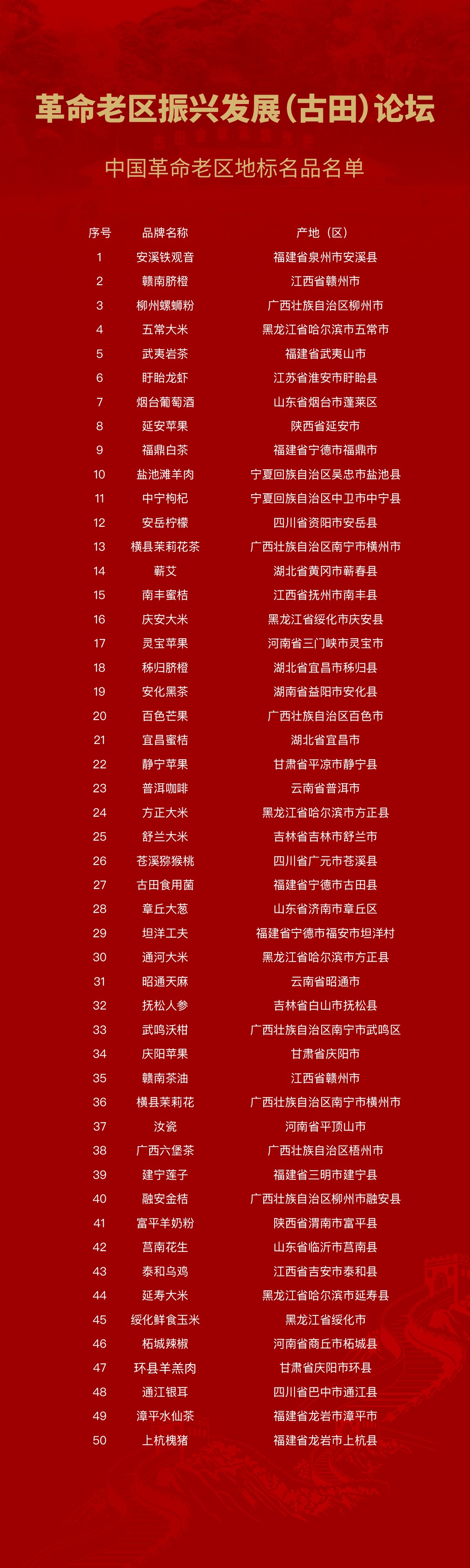 为进一步擦亮革命老区地理标志农产品品牌,放大品牌赋能效应,“革命老区振兴发展(古田)论坛”组委会启动了“革命老区地标名品”遴选工作。经专家评审,50个革命老区地标名品进入推介名单。“革命老区 地标名品”不仅是革命老区的“金字招牌”,也是老区生态优势、资源优势转化为经济优势的生动体现,是老区人民勤劳智慧的结晶,更是连接老区与市场、传承红色基因与地域文化的重要纽带。