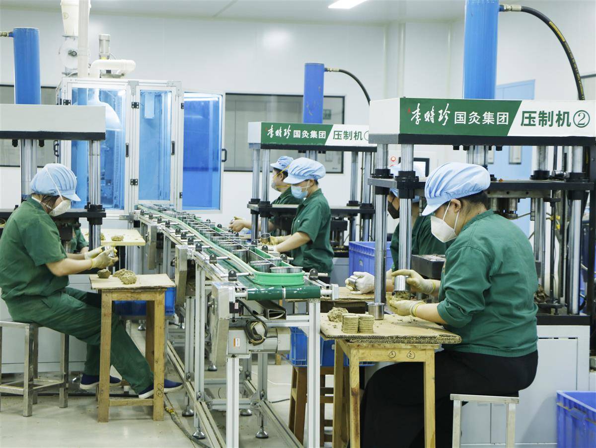 工人在李时珍国灸集团(蕲春)生产蕲艾大健康产品。(湖北日报全媒记者 薛婷 摄)