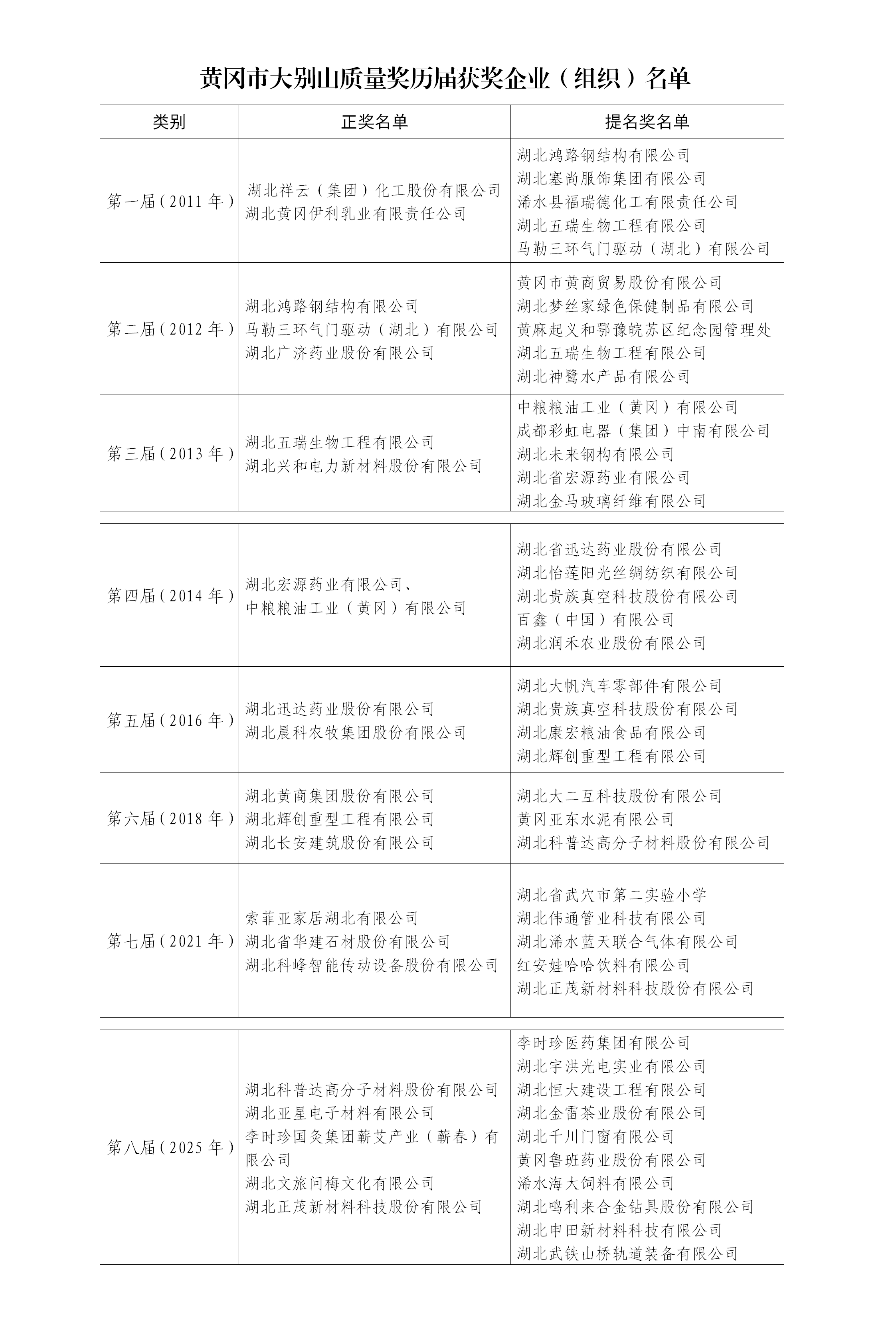 黄冈市大别山质量奖历届获奖企业(组织)名单(黄冈市市场监督管理局供图)