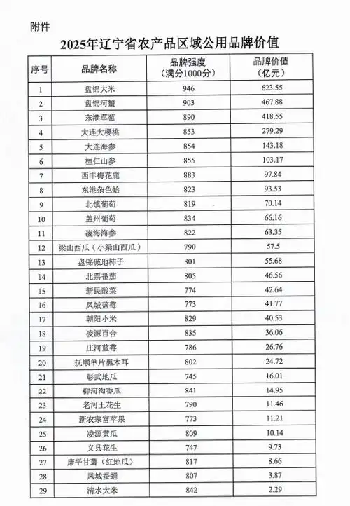 为贯彻落实质量强省品牌强省战略,打造辽宁优质特色农产品品牌,持续提升农产品区域公用品牌价值与影响力,助力乡村产业振兴,辽宁省农业农村厅、辽宁省市场监督管理局共同组织开展2025年农产品区域公用品牌价值测算。经评价,现将29个农产品区域公用品牌价值予以发布。