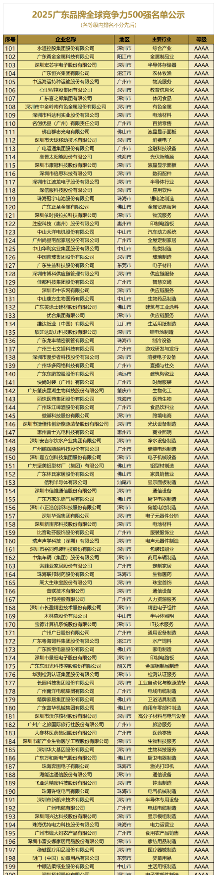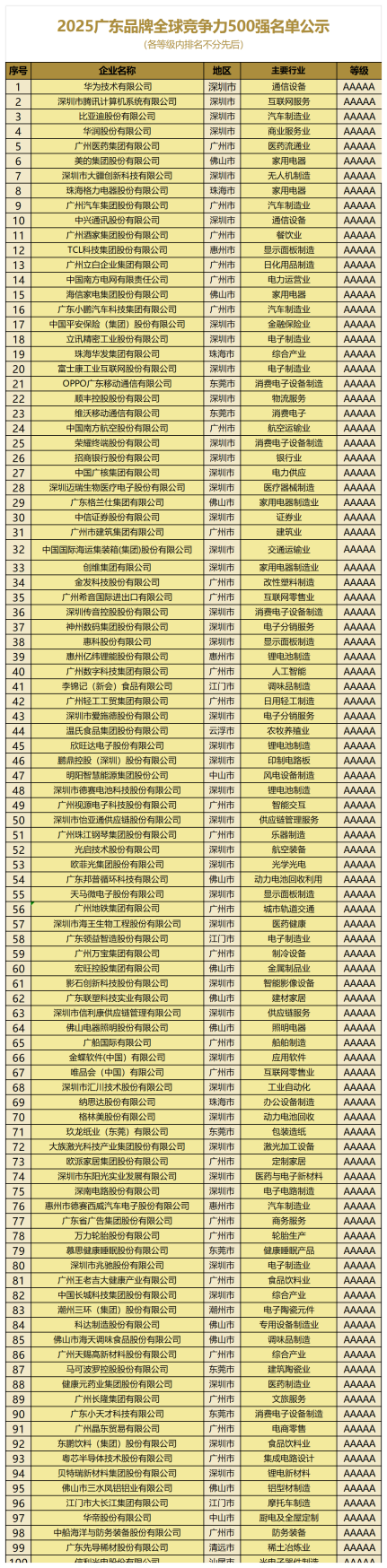 经过企业申报、大数据分析、实地调研和专家评审等多环节评定,最终确定华为、腾讯、比亚迪、美的、格力、广药、王老吉、华润、大疆、广汽、中兴、广州酒家、TCL、立白、南方电网、海信、小鹏、中国平安、立讯精密、华发、富士康、OPPO、顺丰、vivo、南方航空、荣耀、招商银行、中国广核、迈瑞医疗、格兰仕、中信证券、中集、创维、金发、怡亚通、希音、传音、惠科、亿纬锂能、李锦记、爱施德、欣旺达、温氏、德赛电池、欧菲光、万宝、影石、联塑、广船、佛山照明、德赛西威、金蝶、纳思达、格林美、玖龙、大族激光、欧派、深南电路、慕思、海天、马可波罗、长隆、步步高、粤芯半导体、贝特瑞、凤铝、大长江、华帝、先导稀材、信利光电、薇美姿、昊志机电、双喜电器、昊志机电、长园科技、得胜电子、科翔、双喜电器等500家AAA级及以上等级企业入选“2025广东品牌全球竞争力500强”,涵盖制造、科技、消费、金融等多个核心领域,集中展现了广东“制造业当家”的硬核实力与品牌全球化潜力。