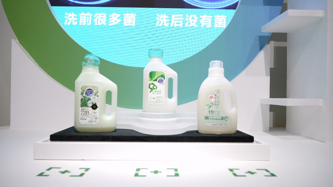 过去,人们买洗衣液,关注的是能否洗干净;现在的消费者会问,它是否呵护面料,香味能否舒缓情绪,成分是否天然安心。纳爱斯集团总裁助理兼创新发展研究院院长刘英向我们介绍道:“我们的核心展品是超能自天然系列洗涤用品。有句话在消费者中广为流传,那就是天然洗护,就是超能。而这款展品凝聚了我们企业,也是整个行业,最先进的天然洗护科技,它突破了天然原料的技术瓶颈,攻克了天然与效能的平衡难题,实现了天然来源成分占比超过90%,敏感肌适用、养护衣物让衣物常洗常新、节水40%、可降解、可回收包材等突出特点和效果。技术入选国家绿色技术推广目录,首批先进适用技术名单,产品不仅为消费者带来更美好的洗护体验,更为行业树立了标杆,向全球输出了可复制的“中国绿色洗护方案”,彰显了中国在日化领域的绿色发展中,无可争议的话语权。”