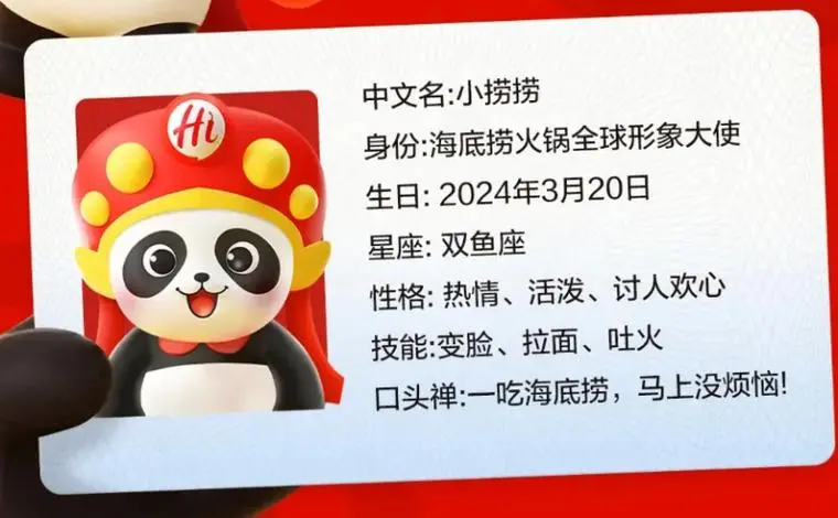 据海底捞介绍,“小捞捞”选取具备全球知名度、高度中国代表性的国宝形象,既契合了海底捞源于四川的历史来路,也巧妙指代了海底捞从四川走向全国、走向世界的成长历程。本次海底捞创新的IP“小捞捞”不仅性格热情活泼,可以和顾客们玩到一起,还掌握了变脸、拉面、吐火等多项专属技能,和海底捞工作人员高度吻合,充分展现了海底捞工作人员分享美食、分享快乐的使命。