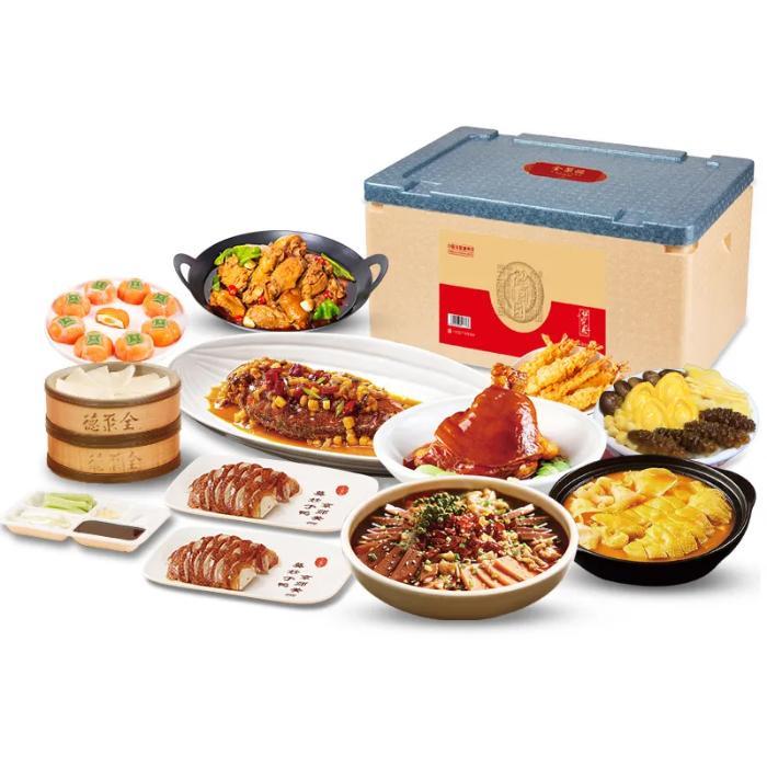 全聚德家宴礼盒主打菜系融合,每一盒均配备了全聚德的招牌美味——手工片制烤鸭,传承百年经典烤制技艺,每一片都散发着正宗的香气。另外,礼盒中汇聚了全聚德、四川饭店、丰泽园、仿膳四大品牌的预制菜与面点,京菜、鲁菜、川菜、宫廷面点,一应俱全,让消费者一盒吃遍京川鲁三大菜系名菜,在家就能享受到饭店级豪华年夜饭大餐。
