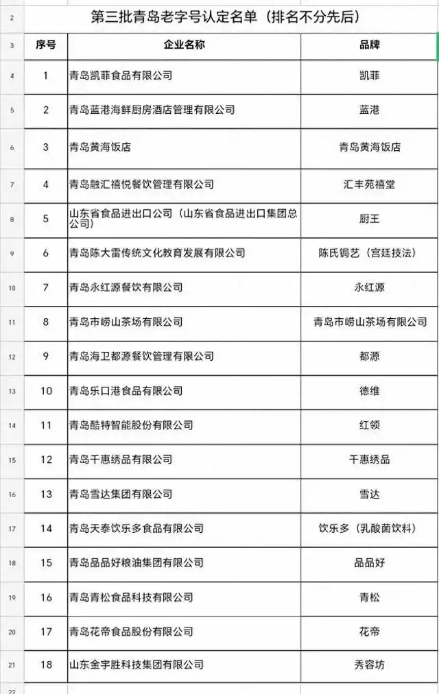 日前,市商务局公布了第三批青岛老字号企业名单,共有青岛永红源餐饮有限公司的品牌永红源、青岛酷特智能股份有限公司的品牌红领、青岛天泰饮乐多食品有限公司乳酸菌饮料品牌饮乐多等18家企业和品牌入选。